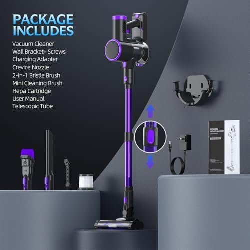 [High Efficiency Filter & 1.5 Liter Large Dust Cup]: This cordless stick vacuum cleaner has a 6-layer filtration system that removes up to 99.99% of microscopic dust particles, which not only prolongs the lifespan of the vacuum cleaner but also keeps the indoor air clean. The dust collection cup at the bottom features a one-touch dumping design, allowing you to dispose of waste without touching it, bringing a more convenient and hygienic user experience.