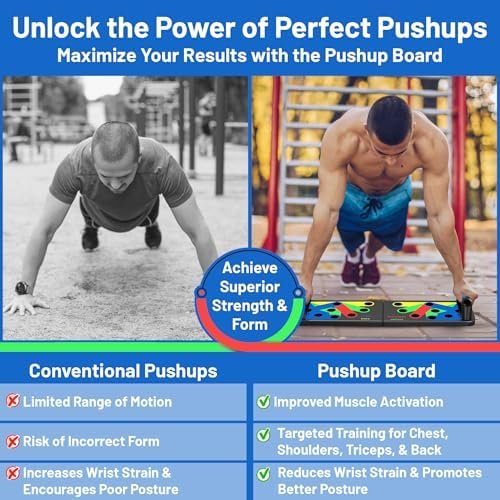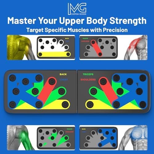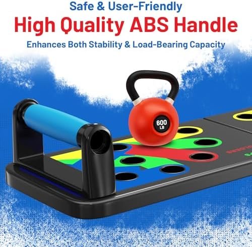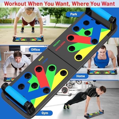 💪 𝐌𝐮𝐥𝐭𝐢-𝐟𝐮𝐧𝐜𝐭𝐢𝐨𝐧𝐚𝐥 𝐏𝐮𝐬𝐡 𝐔𝐩 𝐁𝐨𝐚𝐫𝐝 – A more focused and effective push up training system is color-coded, targeting the specific upper body parts like yellow for the back, blue for the chest, red for the shoulders, and green for the triceps. Work on different muscle groups to help you gain more muscles, strengthen and sculpt the upper body, and enhance stability.