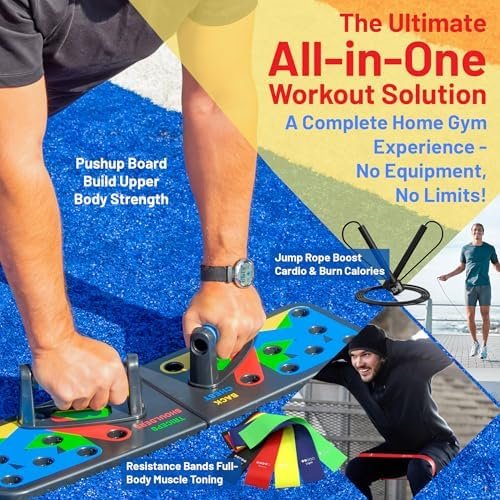 💪 𝐏𝐨𝐫𝐭𝐚𝐛𝐥𝐞 𝐇𝐨𝐦𝐞 𝐖𝐨𝐫𝐤𝐨𝐮𝐭 𝐒𝐞𝐭 – This all-in-one fitness kit includes a Pushup Board for targeting specific muscle groups and building upper body strength, Resistance Bands for full-body muscle toning and flexibility, and a Jump Rope to boost cardio and endurance. Ideal for a complete full-body workout, no matter where you are.