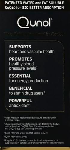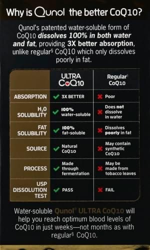 100% WATER AND FAT-SOLUBLE: Qunol CoQ10’s patented formulation is 100% water and fat-soluble, unlike regular CoQ10 that does not dissolve in water and dissolves very poorly in fat